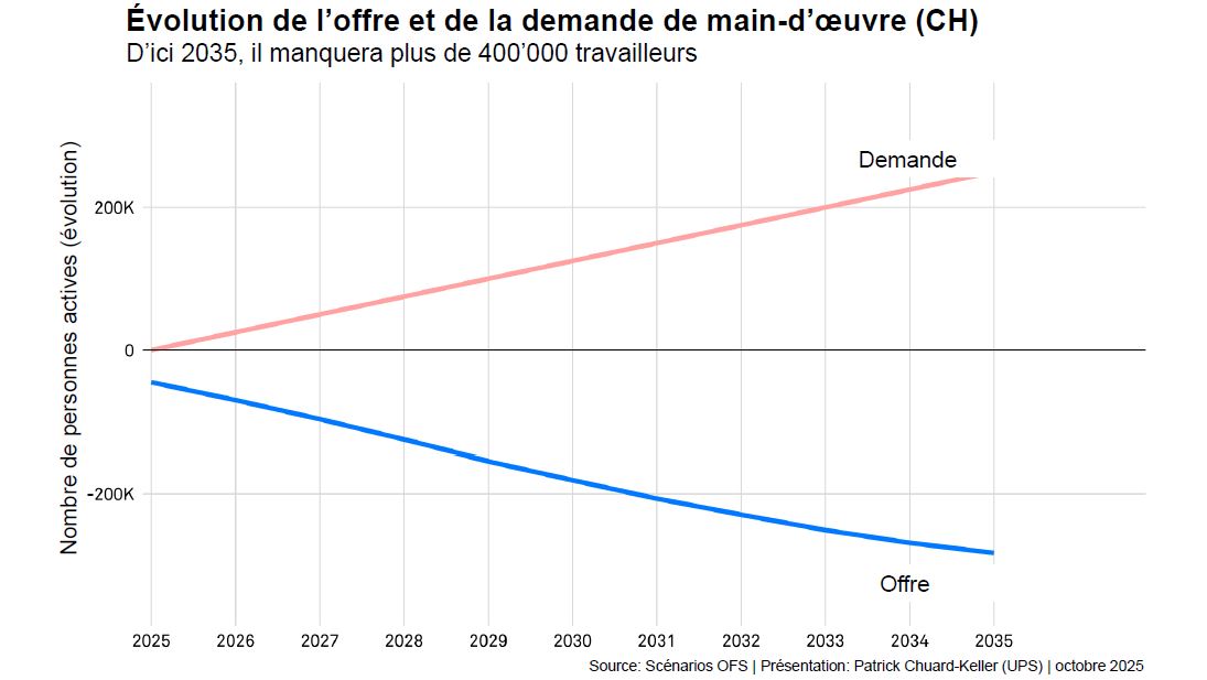 Les faiblesses conjoncturelles à court terme ne changent rien au problème structurel de fond: la génération du baby-boom part à la retraite et la main-d’œuvre nationale qui arrive sur le marché ne suffit pas à compenser. Chaque année, la Suisse perd donc environ 25 000 travailleurs et travailleuses.