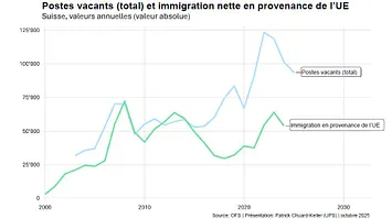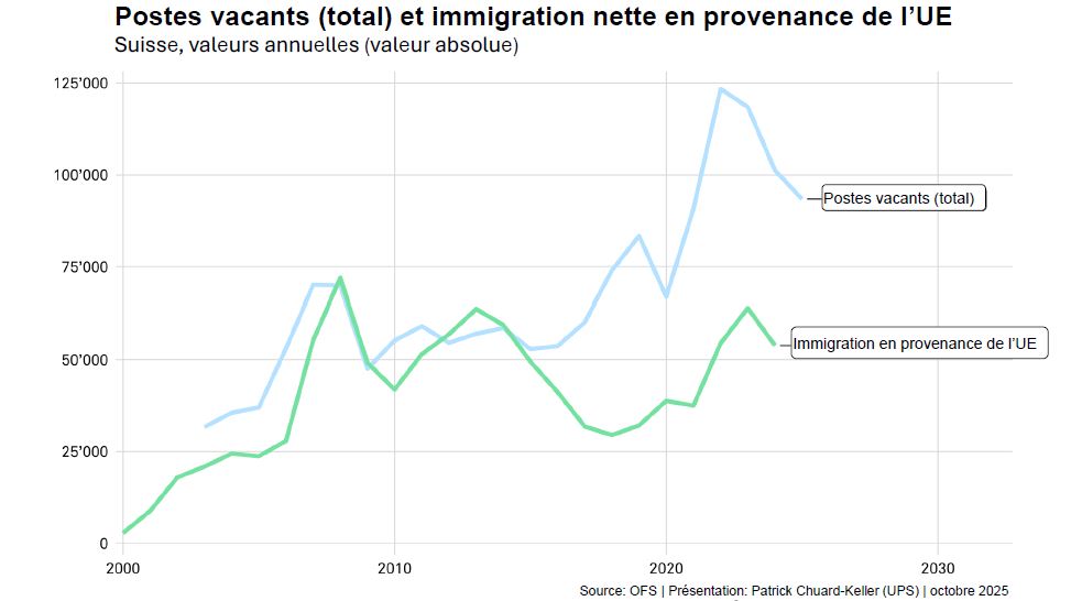 En y regardant de plus près, les pays de l’UE font face aux mêmes défis démographiques. Partout, la main-d’œuvre diminue et les États rivalisent d’incitations pour garder leur main-d’œuvre qualifiée. Les données le montrent: la dynamique de l’immigration nette en Suisse s’essouffle. Depuis une dizaine d’années, elle ne suit plus le nombre de postes vacants.