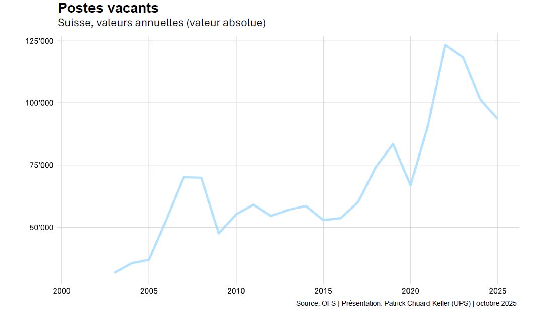 Enfin un peu de répit sur le marché du travail, entend-on dire. Le nombre de postes vacants diminue et les entreprises trouvent à nouveau plus facilement du personnel. Les chiffres de l’OFS montrent effectivement une baisse par rapport aux sommets atteints juste après la crise du COVID-19. En parallèle, le chômage augmente. Certains y voient la fin de la pénurie de main-d’œuvre qualifiée, voire de la pénurie de main-d’œuvre tout court.