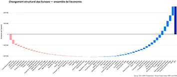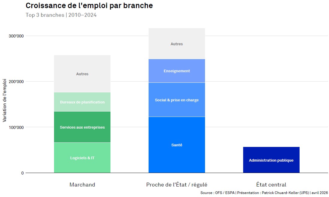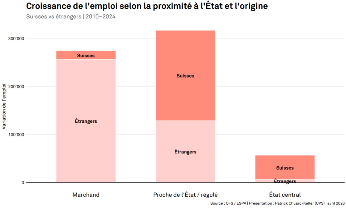 L’évolution de l’emploi suit une tendance claire : dans les secteurs axés sur le marché, la croissance supplémentaire enregistrée ces dernières années a été presque exclusivement portée par les étrangers, tandis que les Suisses ont davantage progressé dans les secteurs proches de l’État et dans l’administration publique.