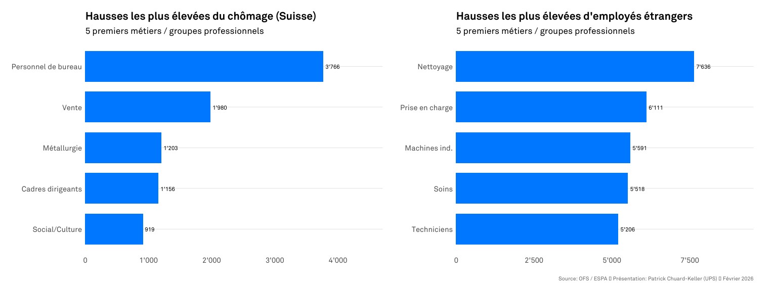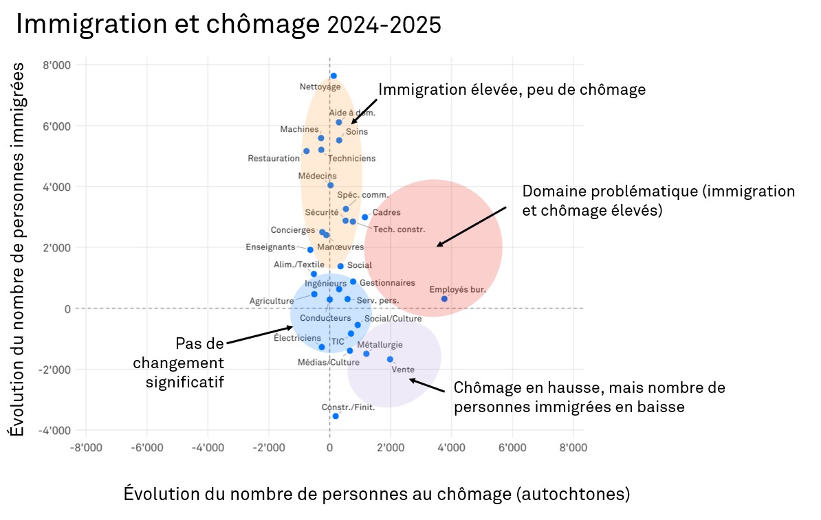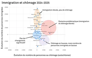 Un schéma clair se dessine : dans les groupes de profession qui ont connu une forte immigration au cours des deux dernières années, comme le nettoyage, la technique, l’encadrement ou l’exploitation d’installations, le chômage des résidents n’a pas augmenté. À l’inverse, l’immigration est restée plus faible dans les métiers où le chômage des résidents a progressé. C’est notamment le cas des employés de bureau et de la vente, et dans une moindre mesure des métiers de la métallurgie et des médias.