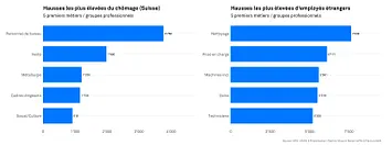 L’illustration 2 ci-dessous présente ce constat de manière encore plus simple. Elle montre en un coup d’œil les groupes de professions dans lesquels le chômage a le plus augmenté et ceux où l’immigration a été particulièrement forte. Les deux illustrations diffèrent nettement : la hausse la plus importante du chômage s’observe surtout chez les employés de bureau et dans la vente, tandis que l’augmentation la plus marquée parmi les travailleurs immigrés concerne les services de nettoyage, les techniciens et les professions d’encadrement.