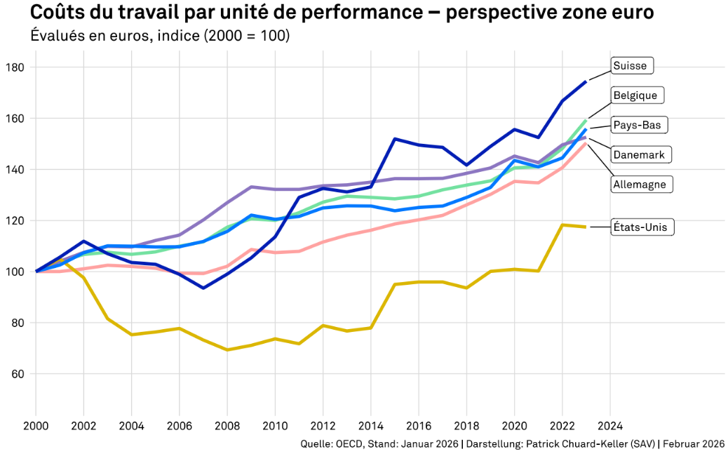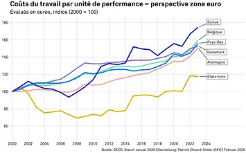 Les mises en garde concernant le déclin de la compétitivité ne doivent pas être balayées comme de simples préoccupations de chefs d’entreprises. En effet, l’augmentation constante des coûts salariaux unitaires nous concerne tous, car elle met en péril la compétitivité de l’économie d’exportation – sa position relative face à la concurrence directe avec ses concurrents étrangers.