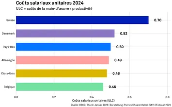 L’illustration 2 montre les coûts salariaux unitaires en Suisse et dans d’autres pays. En Suisse, 1 franc de prestations économiques nécessite des coûts salariaux de 70 centimes (coûts salariaux unitaires = 0,7). En d’autres termes : chaque franc de valeur ajoutée coûte en moyenne 70 centimes de travail aux entreprises suisses.