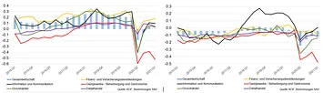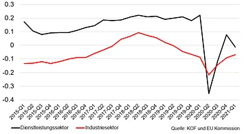 L’examen des évaluations dans l’industrie et le secteur des services montre que dans l’industrie, la situation est vue de plus en plus positivement, alors qu’on la juge de nouveau plus défavorable dans les services en raison des nouvelles mesures de lutte contre le coronavirus qui ont été mises en œuvre (voir figure 1). Dans le secteur tertiaire, en effet, l’industrie hôtelière et certains segments du commerce de détail stationnaire souffrent tout particulièrement.