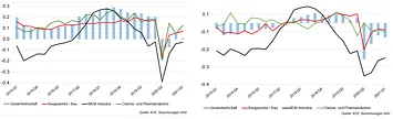 Figures 4 et 5: Série comparative de l’évaluation des affaires (g.) et de de l’emploi (dr.) de certaines branches du secteur industriel et de l’économie dans son ensemble