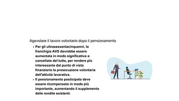 Per gli ultrasessantacinquenni, la franchigia AVS dovrebbe essere aumentata in modo significativo o cancellato del tutto, per rendere più interessante dal punto di vista finanziario la prosecuzione volontaria dell’attività lavorativa.