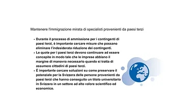 In generale, gli imprenditori mettono in guardia dal fissare contingenti troppo restrittivi nei confronti dei paesi terzi. Ciò renderebbe un cattivo servizio alla piazza economica svizzera, perché le quote troppo rigide non proteggono i posti di lavoro nazionali. Significano piuttosto che le imprese che lottano per accaparrarsi specialisti internazionali devono valutare se sussistono ancora le condizioni necessarie per operare con successo in Svizzera. Quando pianificano le attività imprenditoriali, è essenziale che le imprese siano certe che vi sia il margine necessario per assumere cittadini di paesi terzi.