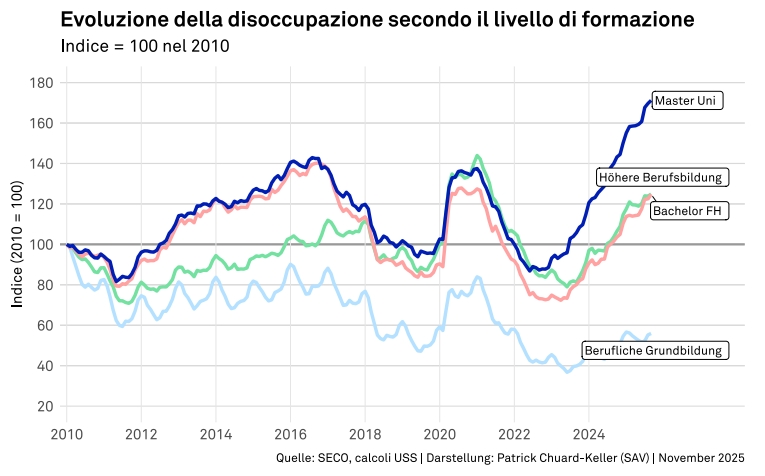Ciò che stupisce, però, e questo ci porta alla notizia meno positiva, è l’evoluzione: dal 2010 il numero di disoccupati con un master universitario è aumentato di circa il 70%. Ciò è tanto più sorprendente se si considera che nello stesso periodo il numero di disoccupati con una formazione professionale di base è diminuito del 40%, come mostra il grafico seguente.