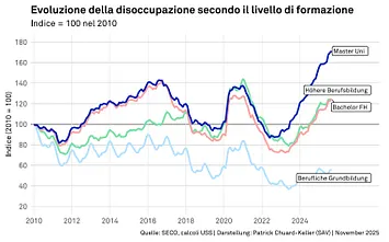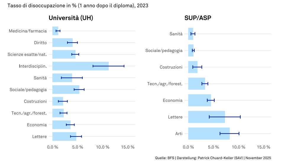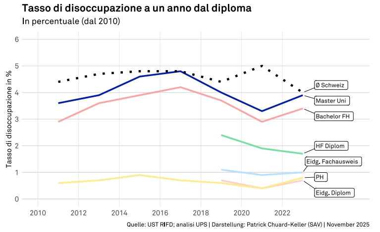 Prima di tutto la buona notizia per tutti gli studenti: la formazione continua a proteggere dalla disoccupazione. Anche nella fase ancora piuttosto critica un anno dopo il conseguimento del diploma, il tasso di disoccupazione dei laureati con un master è inferiore alla media svizzera. Anche nel complesso, il livello terziario si dimostra solido: nell’ottobre 2025 il tasso di disoccupazione era del 2,2%, inferiore a quello delle persone con un diploma di scuola secondaria II (2,7%).