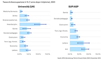 Inoltre, gli studenti scelgono il proprio corso di studi senza quelle (sensate) restrizioni legate al mercato del lavoro che nel sistema di formazione professionale sono dettate dall’offerta di posti di apprendistato. Ciò si riflette in differenze talvolta significative nel tasso di disoccupazione tra i singoli indirizzi di studio, sia nelle università che nelle scuole universitarie professionali (vedi grafico «Tasso di disoccupazione per indirizzo di studio 2023»).