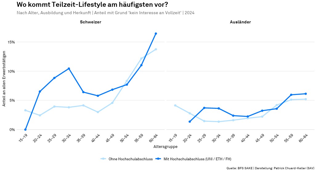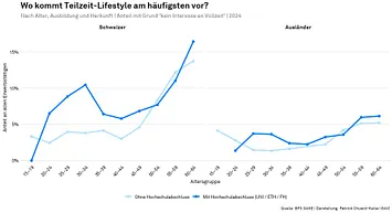 Abbildung 2: Lifestyle-Teilzeit kommt häufiger bei Schweizerinnen und Schweizern vor. Neben dem Alter spielt auch die Ausbildung eine Rolle. Insbesondere bei jüngeren Schweizerinnen und Schweizern mit Hochschulabschluss ist diese Art der Teilzeit verbreitet.
