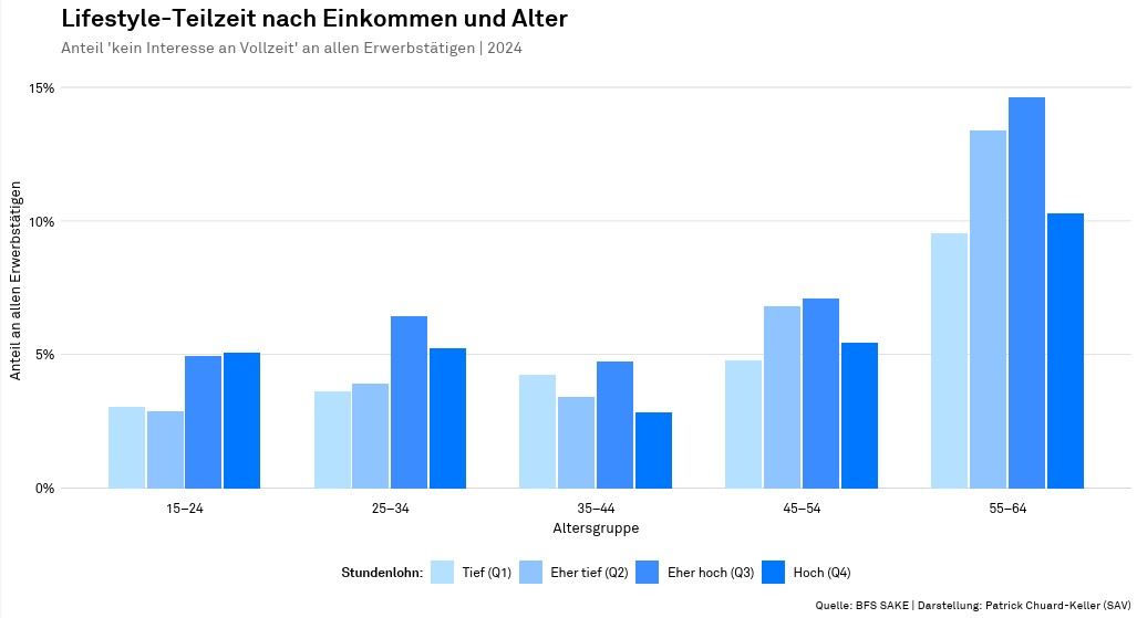 Es lässt sich vermuten, dass die höhere Lifestyle-Teilzeitquote unter Schweizer Arbeitskräften mit Hochschulabschluss auf einer ökonomischen Abwägung beruht: Dank hoher Stundenlöhne erreichen sie ihr gewünschtes Konsumniveau schneller, wodurch der Nutzen jedes zusätzlichen Frankens gegenüber dem Wert gewonnener Freizeit abnimmt. In vielen dieser Haushalte dürfte das Budget so komfortabel sein, dass eine Pensumsreduktion den Lebensstandard nicht spürbar tangiert – auch vor dem Hintergrund der Steuerprogression. Die gleichen Gründe dürften auch bei älteren Arbeitskräften eine Rolle spielen.