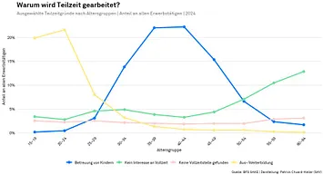 Abbildung 1 zeigt, wie sich die Gründe für Teilzeit über das Erwerbsleben verändern. In jungen Jahren ist Aus- und Weiterbildung der Hauptgrund für Teilzeitarbeit. In den 30ern und 40ern verschiebt sich der Hauptgrund zur Kinderbetreuung.